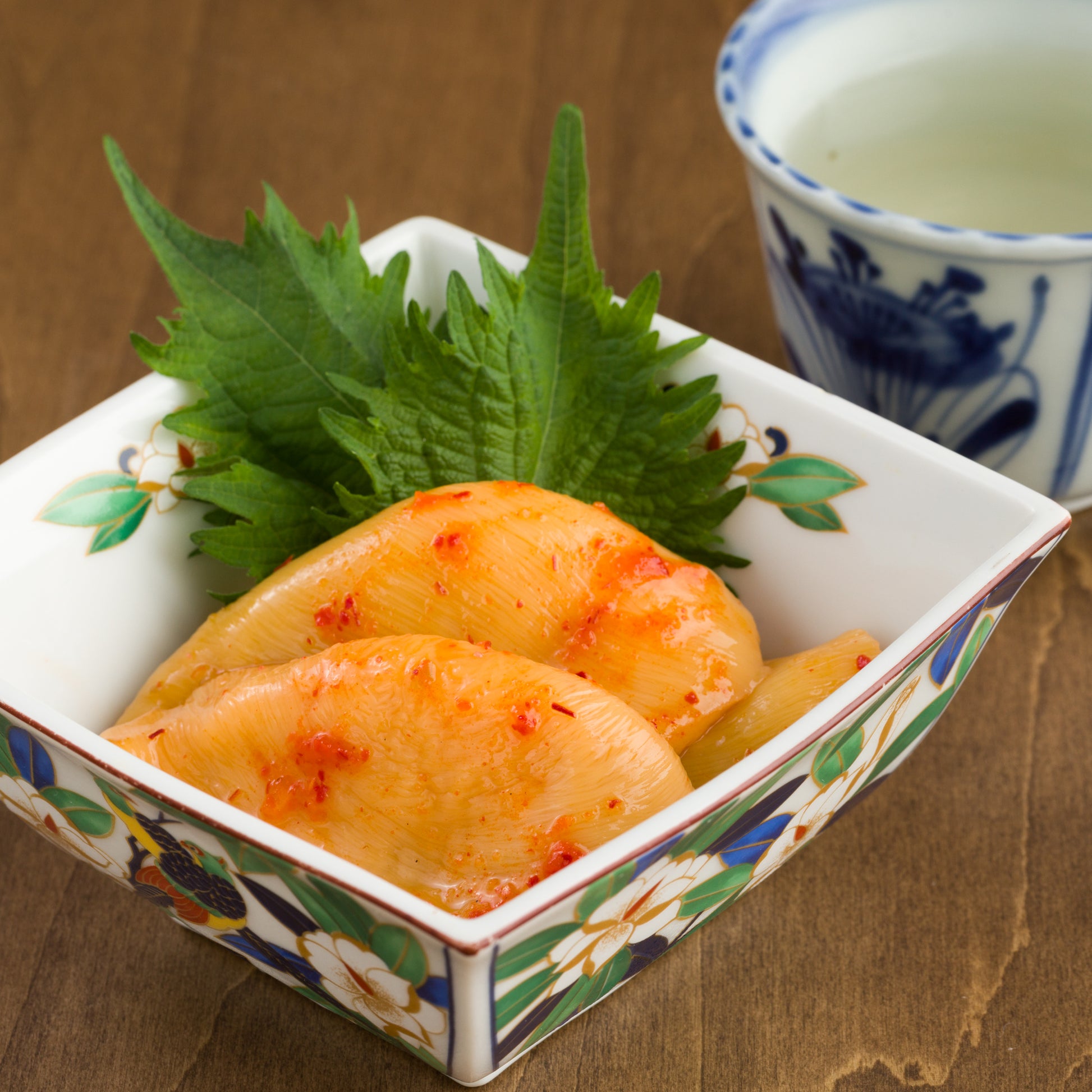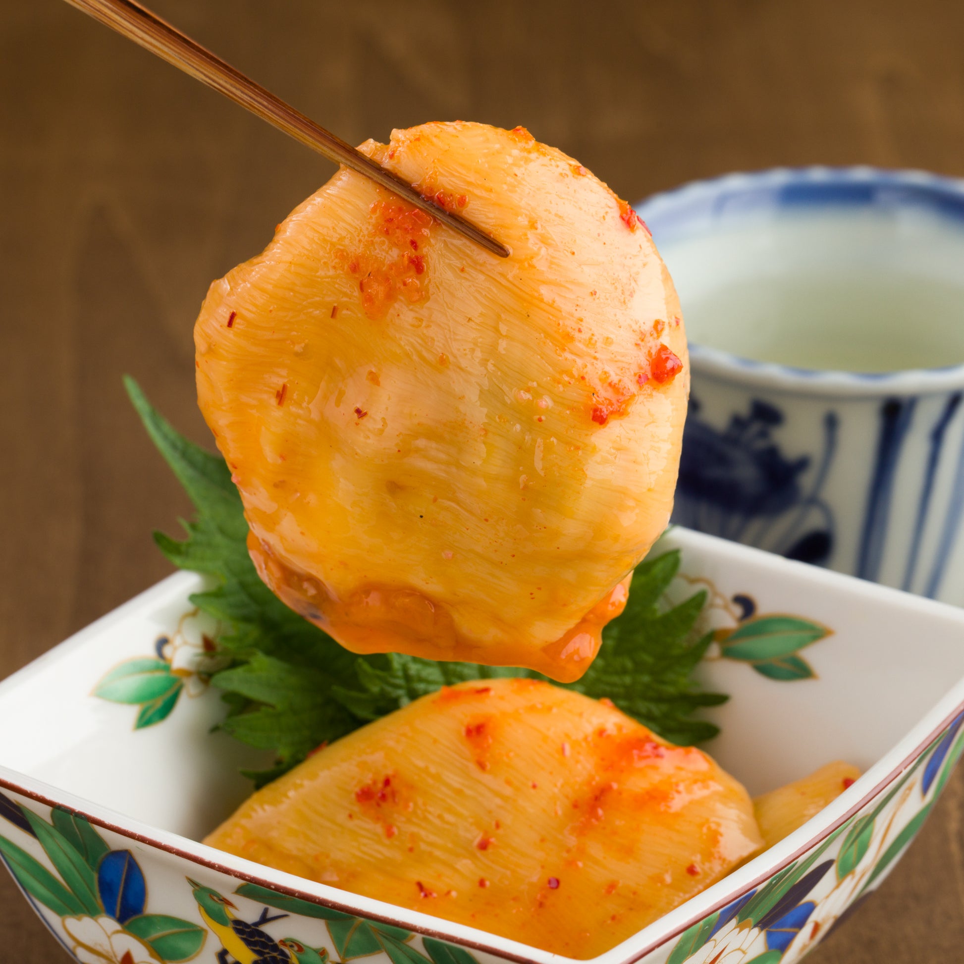 新鮮なホヤを厳選し、伝統的な製法で発酵させたキムチと合わせることで、風味豊かな味わいをお楽しみいただけます。ホヤ特有のほどよい食感とキムチの辛味が絶妙に調和し、食欲をそそる逸品です。